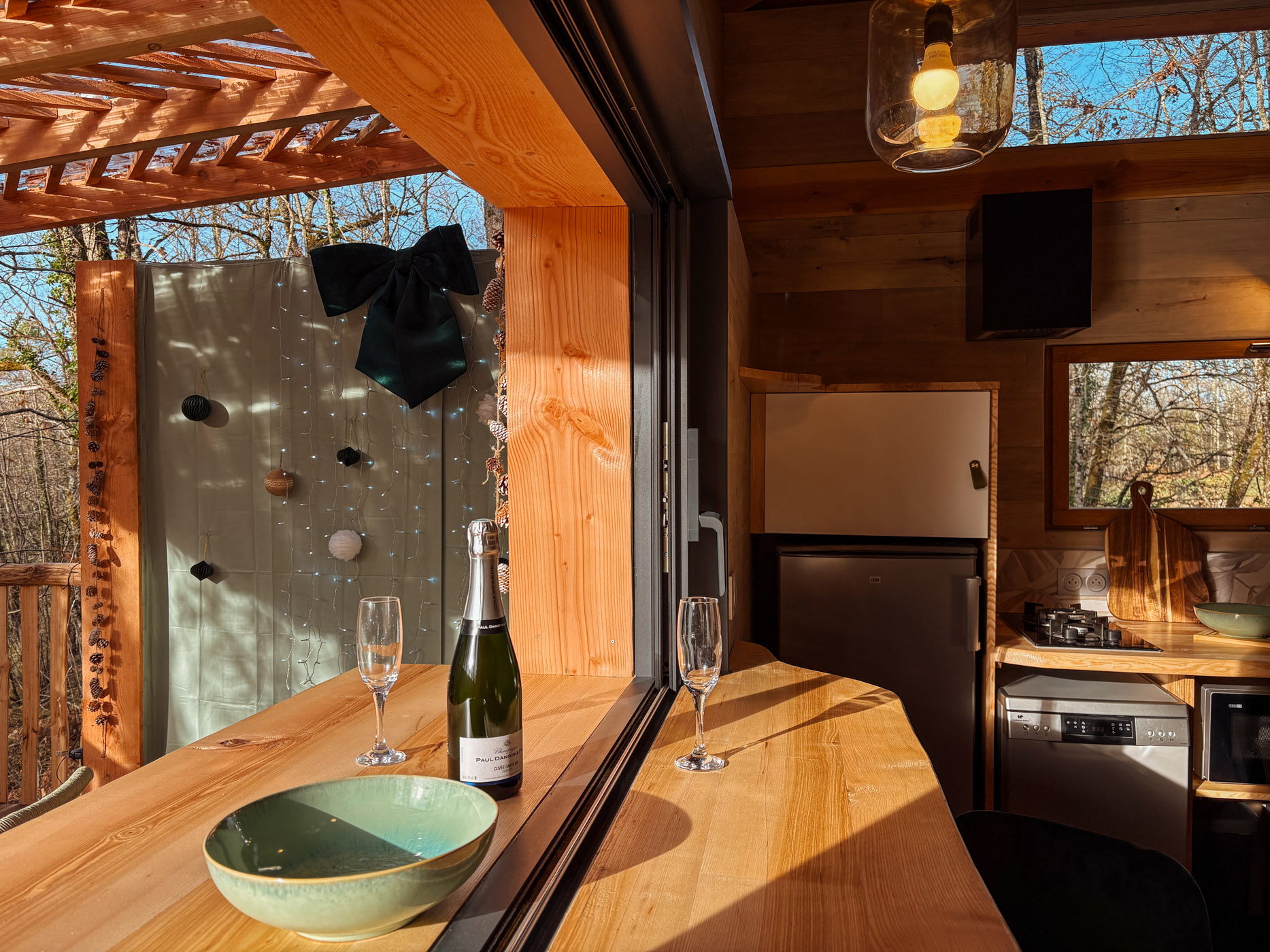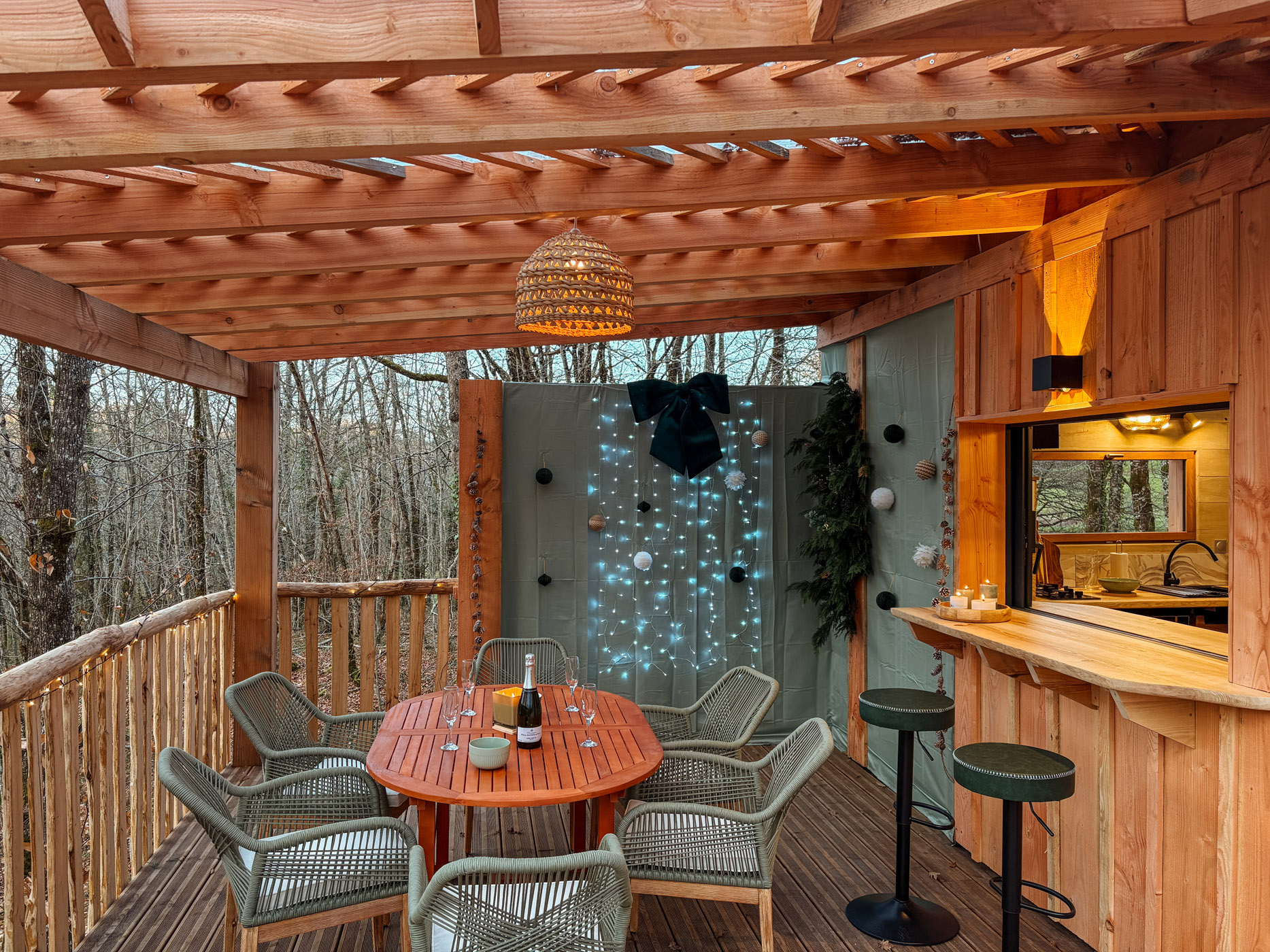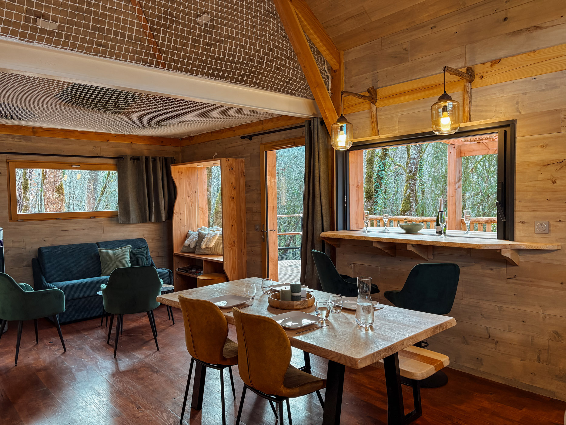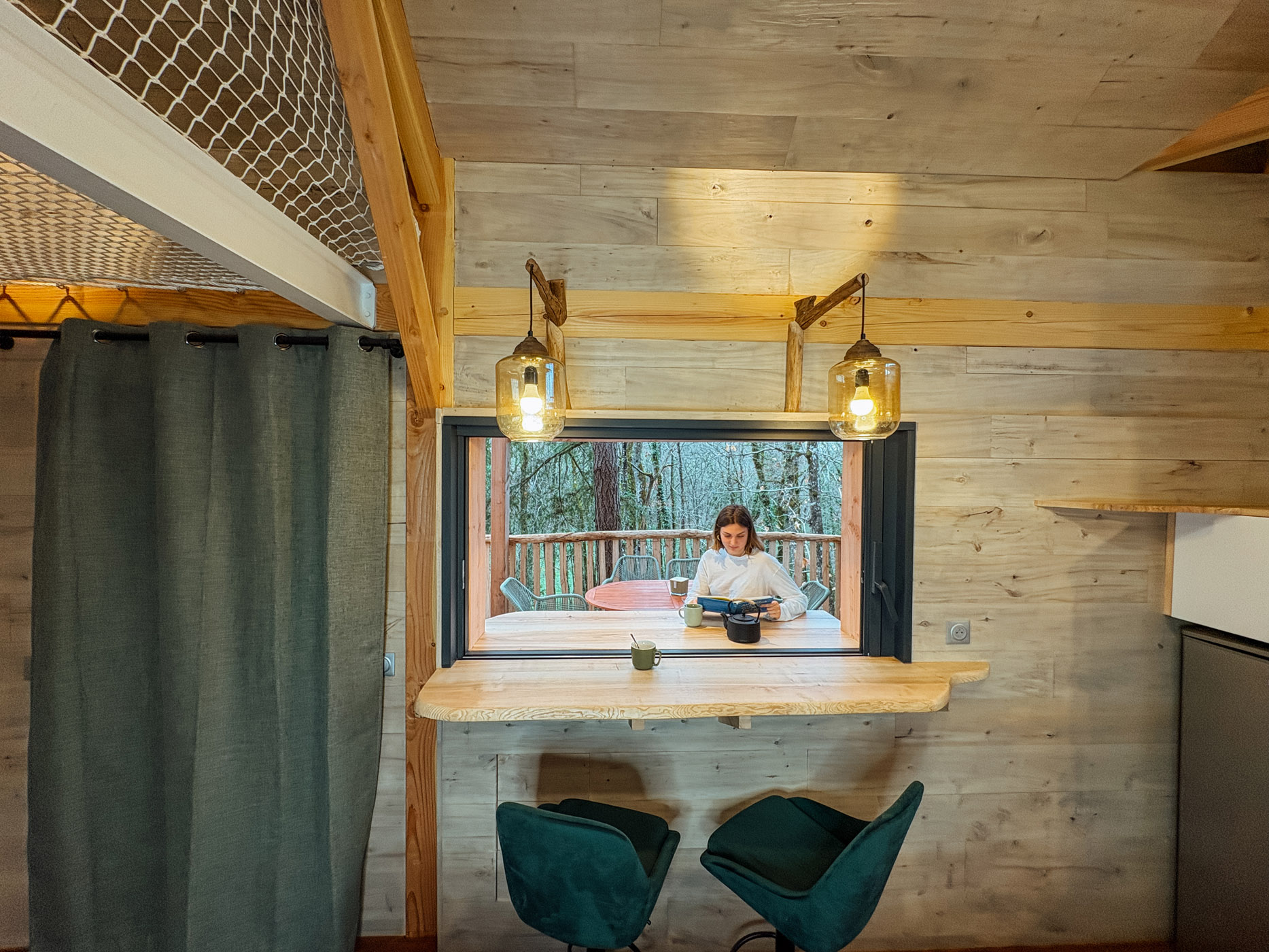 Les petits déjeuners, ainsi que les planches et les dîners vous sont servis dans un panier en bas de votre cabane. Il ne vous reste qu’à les hisser jusqu’en haut grâce à la poulie pour les déguster en toute intimité. Les boissons ne sont pas incluses mais elles sont en vente directe à la P’tite Boutique !