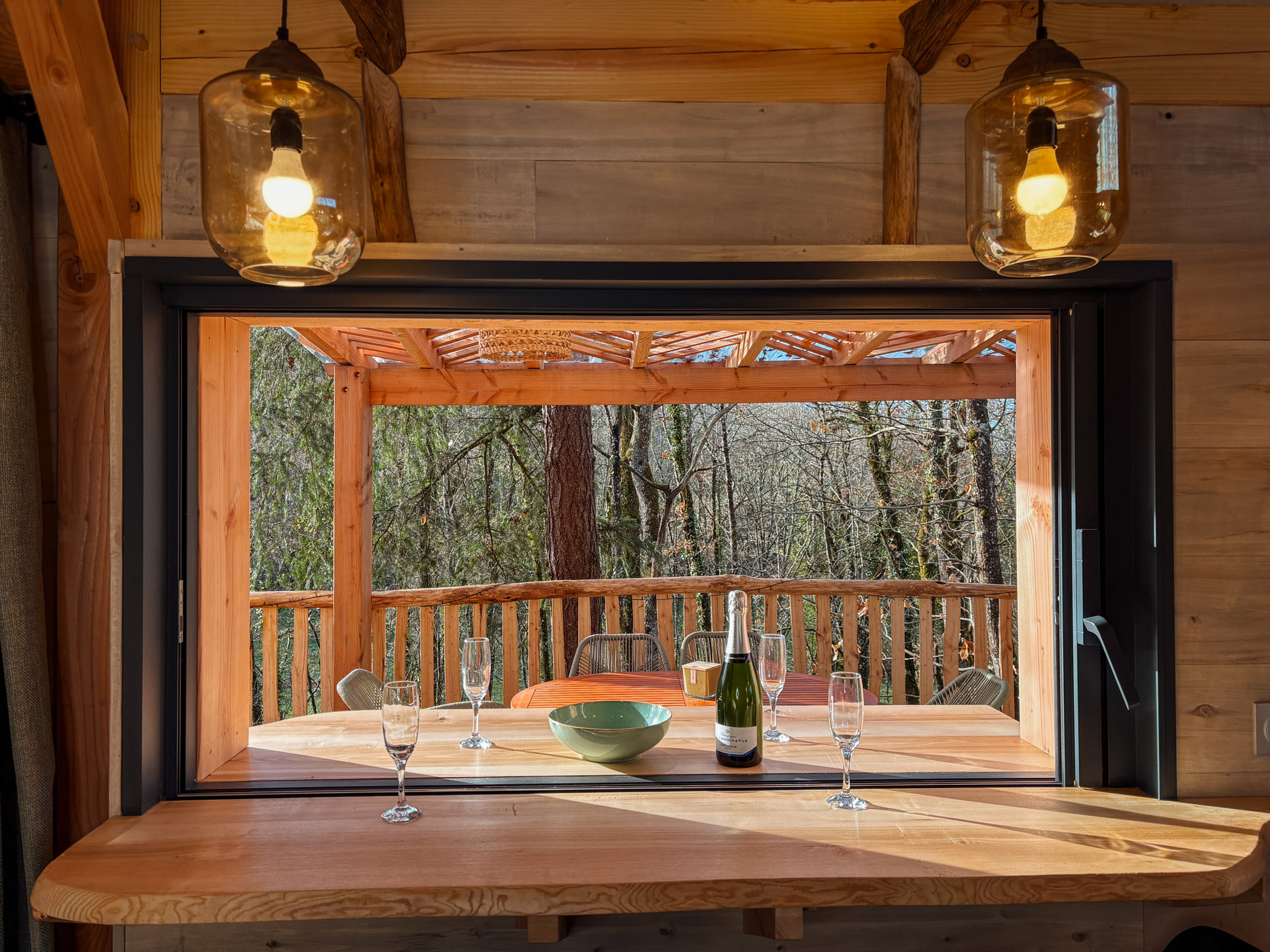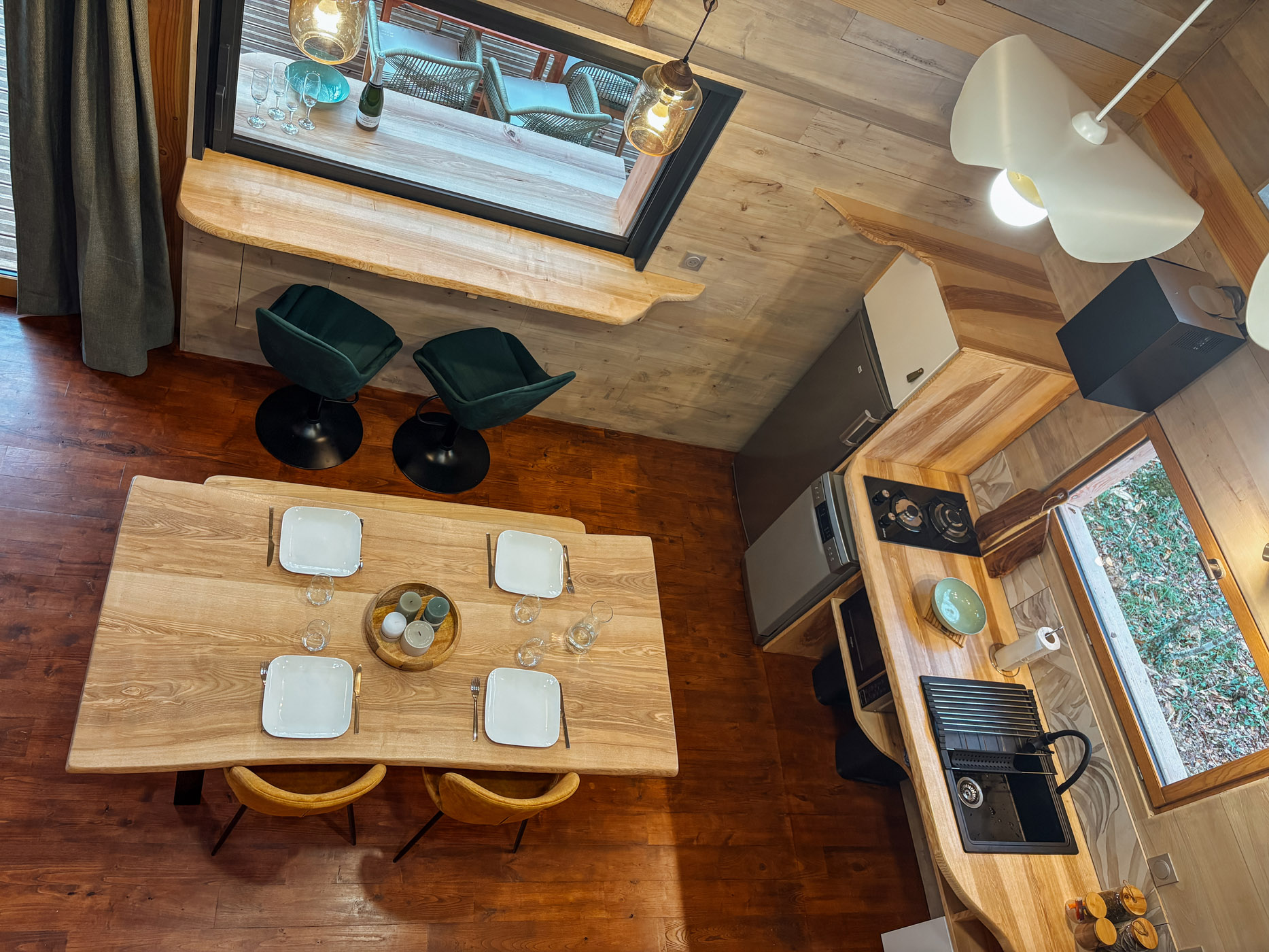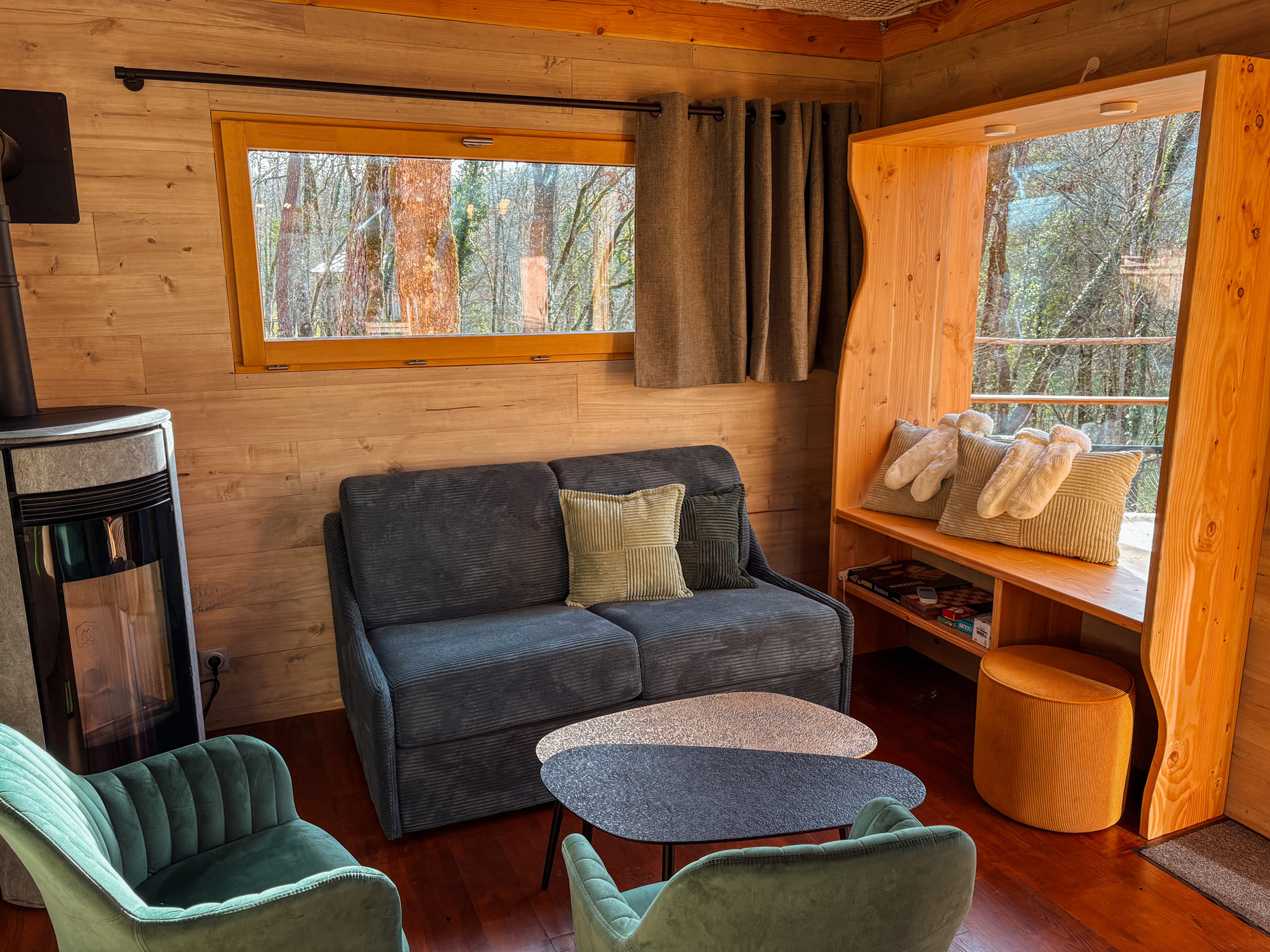 Les petits déjeuners, ainsi que les planches et les dîners vous sont servis dans un panier en bas de votre cabane. Il ne vous reste qu’à les hisser jusqu’en haut grâce à la poulie pour les déguster en toute intimité. Les boissons ne sont pas incluses mais elles sont en vente directe à la P’tite Boutique !